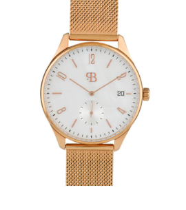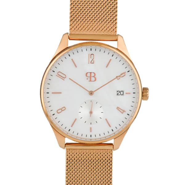 Мужские часы ТД Полёт из коллекции "Русское время" выполнены в форме круга с корпусом из нержавеющей стали и полным PVD-покрытием цвета розового золота. Красивый перламутровый циферблат с эффектом мрамора. Индексы, арабские цифры, часовая и минутная стрелки цвета розового золота. Апертура даты в позиции 3 часов. Точность хода обеспечивает японский кварцевый механизм Seiko VL58. Циферблат защищен минеральным стеклом. Способ отображения времени аналоговый (стрелки), формат 12/24 часов, секундная стрелка смещённая. Диаметр: 42,2 мм. Браслет миланского плетения из нерж. стали с регулируемой застёжкой шириной 20 мм. Водонепроницаемость WR30 (брызги, дождь).