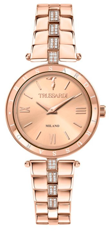 Часы кварцевые, женские. Способ отображения времени аналоговый (стрелки), формат 12 часов, секундная стрелка центральная. Водонепроницаемость WR50 (брызги, дождь). Материал корпуса и браслета нерж.сталь, PVD покрытие (полное). Стекло минеральное. Диаметр корпуса 34 мм.