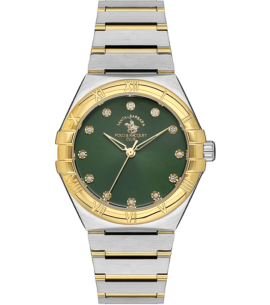 Стильные женские часы из коллекции "Ladies Luxury". Изумрудно-зелёный циферблат выполнен по технологии Sunray (солнечный луч) с метками в виде точек, украшенных кристаллами Swarovski. Римские цифры расположены на безеле. Круглый корпус, браслет выполнены из стали с частичным IP-покрытием цвета жёлтого золота. Браслет шириной 20 мм, раскладывающаяся застёжка. Точность хода обеспечивает японский кварцевый механизм Miyota 2035. Минеральное стекло. Габариты 34 мм. Водонепроницаемость WR50.