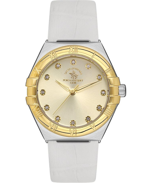 Стильные женские часы из коллекции "Ladies Luxury". Золотистый циферблат выполнен по технологии Sunray (солнечный луч) с метками в виде точек, украшенных кристаллами Swarovski. Римские цифры расположены на безеле. Круглый корпус выполнен из стали с частичным IP-покрытием цвета жёлтого золота. Ремешок белого цвета с классической застежкой, обхват запястья до 190 мм. Точность хода обеспечивает японский кварцевый механизм Miyota 2035. Минеральное стекло. Габариты 34 мм. Водонепроницаемость WR50.